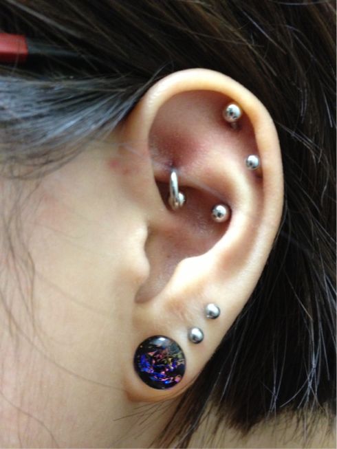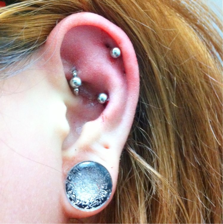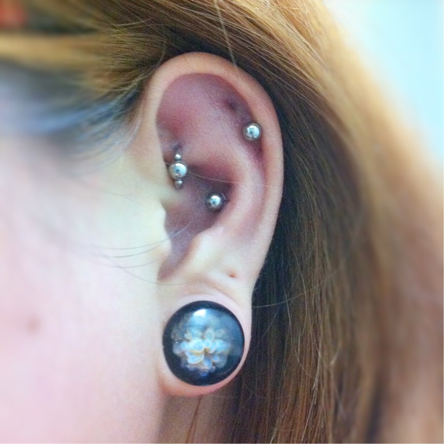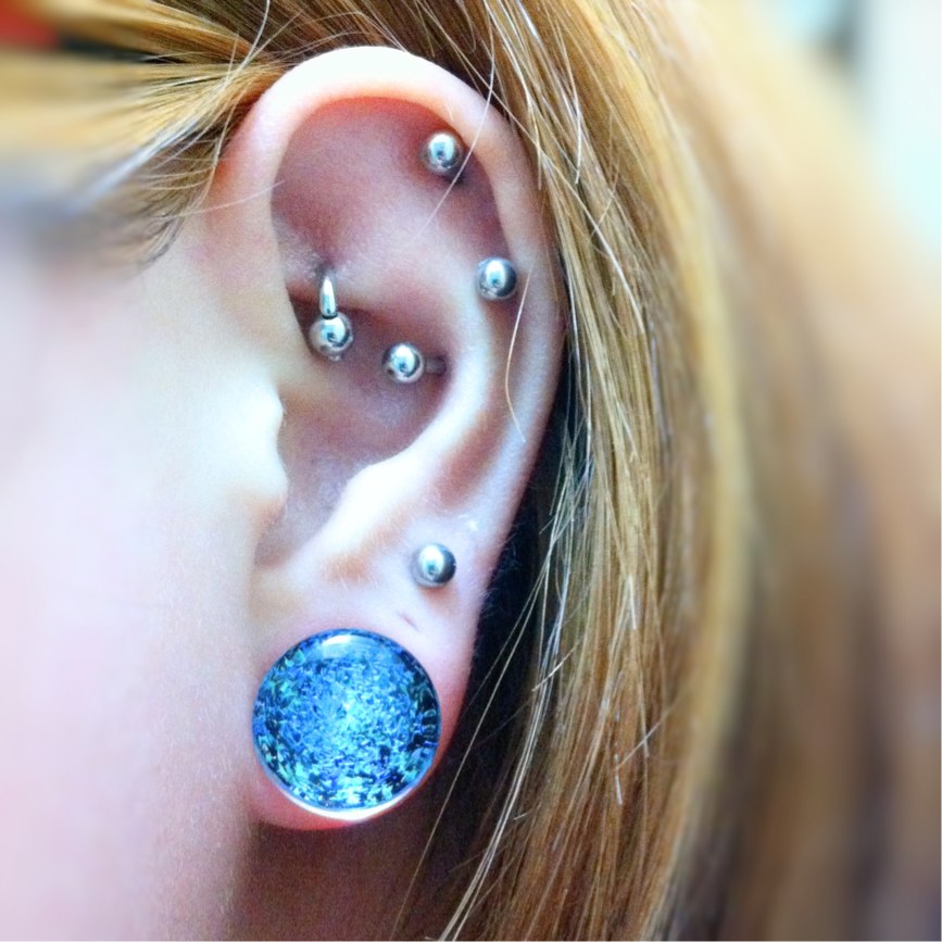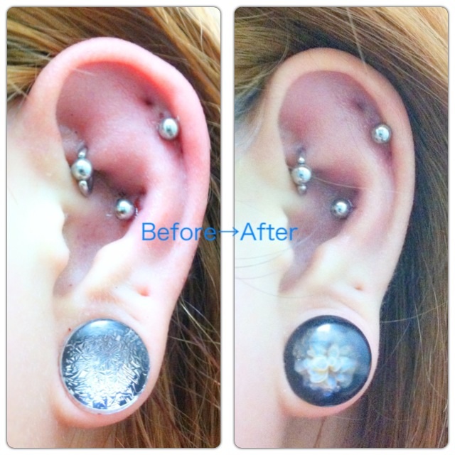 こっちがロックをリングに替えてもらった左耳。ロブは0GGalaxyplug(Pink/Blue)です。