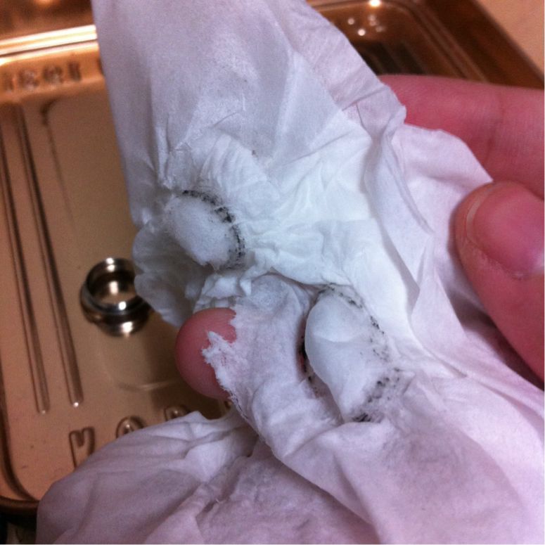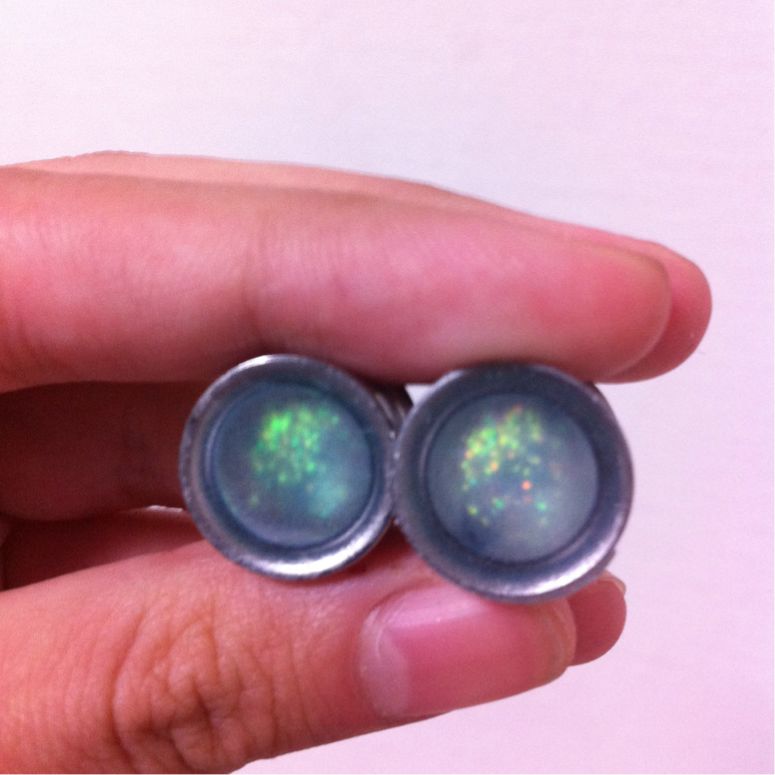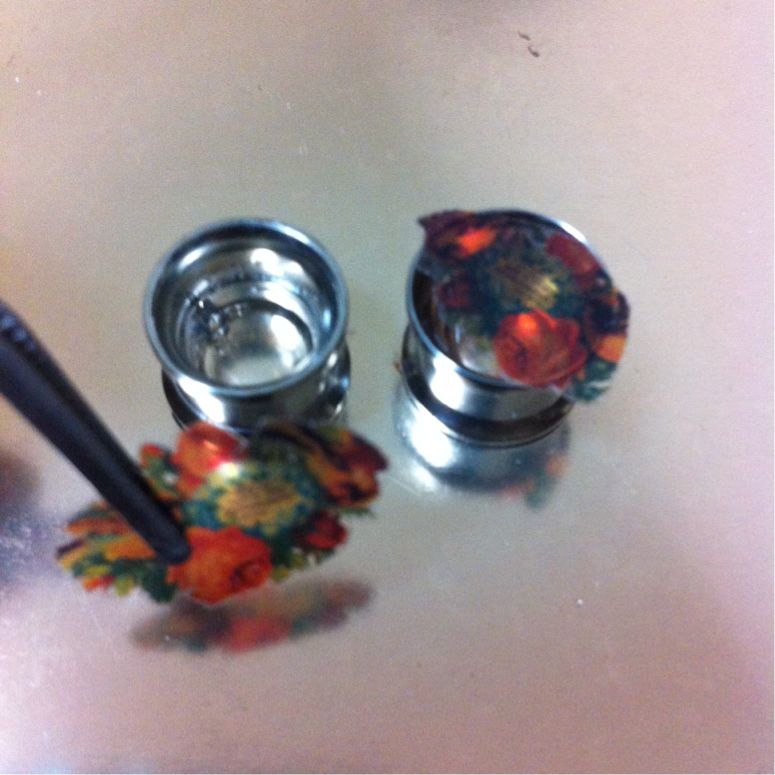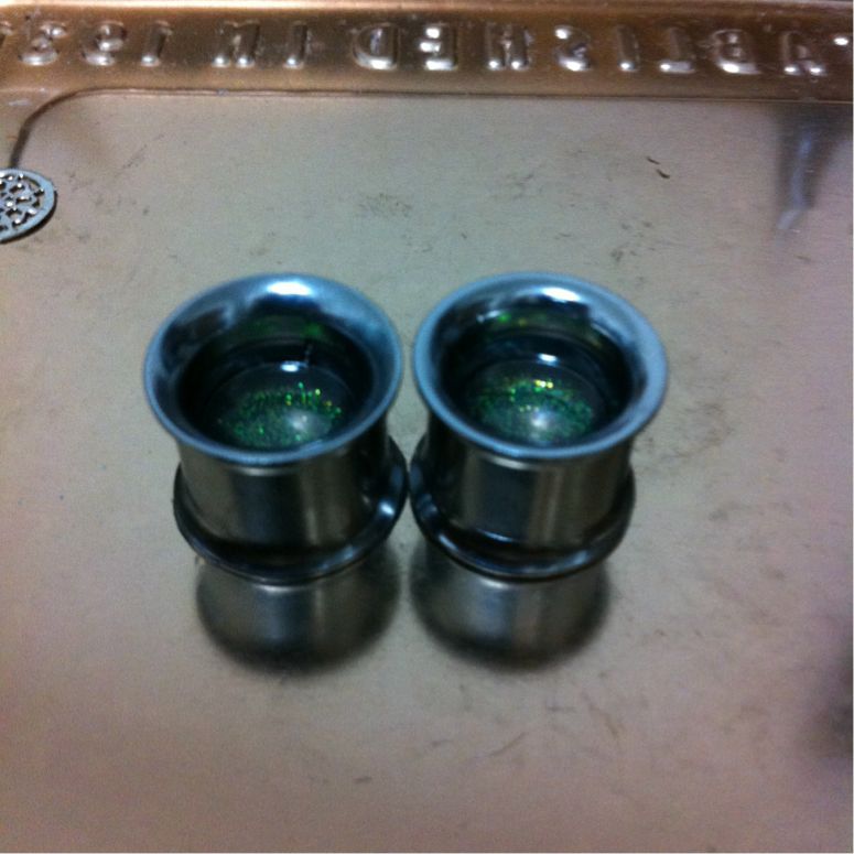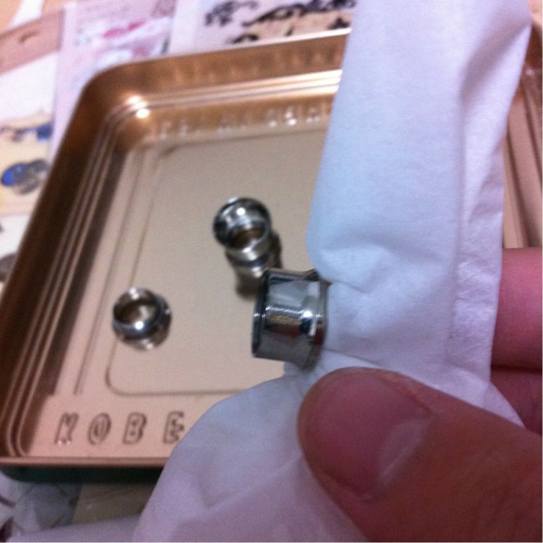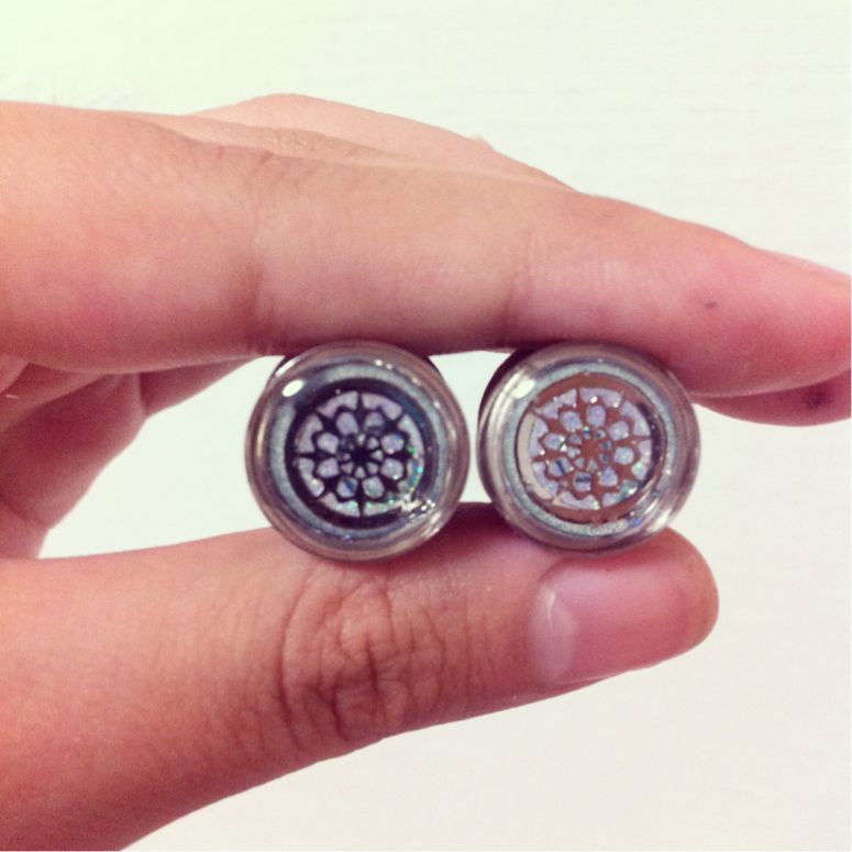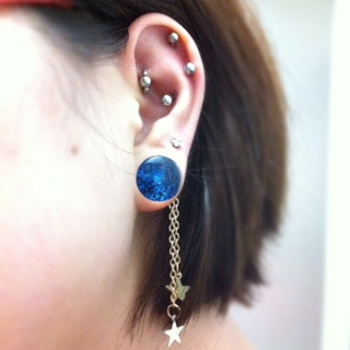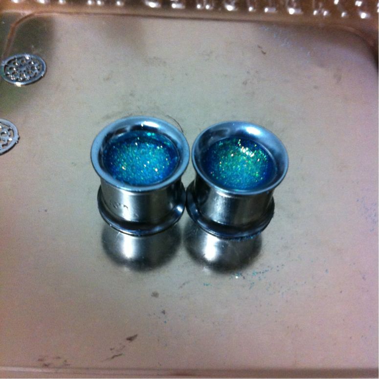 ボディピアス製作 ハンドメイド Comment:1 2013/09/17 すでに買ったのにそれを忘れてまた注文……ということを繰り返していたらいつの間にか1/2"ダブルフレアアイレットが大量に手元にありました。使わないのも勿体無いしオクに出してもいまいち貰い手が付きそうになかったので今までずっとやってみたくて躊躇していたオリジナルプラグの製作用の材料にしてみることに。以下備忘録代わりの制作手順です。用意するもの・ダブルフレアアイレット(シングフレアでも出来そうです)・UVレジン液・UVライト(36Wの物を使用)・爪楊枝(気泡つぶし用)・金属板またはクッキングシート・メタルパーツ、コラージュシート、ラメなど製作1回目:透明お花プラグレジンの透明感をいかして透明なプラスチックのコラージュシートを用いました。初めてというだけあって満足の行く出来にはなりませんでしたが手順を記録しておきます。1.エタノールをつけたティッシュでアイレットと台座の金属板を磨く 綺麗に見えても案外くすみや汚れがあります。台座にする金属板は汚れがあるとアイレットの裏側に付着してしまうためより念入りに磨きました。2.半分程度レジン液を注いで硬化し力ずくで金属板から剥がしパーツを用意 金属板は滑らかなため裏面はつるつる綺麗に仕上がりますがとにかく剥がしづらいです。力を入れすぎて裏面のレジンが少し欠けてしまいました。反省点その1です。パーツはコラージュ用の透明プラスチックシート。サイズを合わせて切り抜いていきます。3.アイレット内に収まるようパーツを切り抜いたら中にセッティングしてレジンを注ぎ硬化この時浮かんでくる気泡は爪楊枝でぷちぷち潰します。コラージュシートだけだと地味だったのでパールのラインストーンも追加しました。4.アイレットからこぼれ落ちない程度(平らになるくらい)にレジンを注ぎ硬化して完成レジンの中でお花パーツが泳いでしまい、アイレットのフチからずれてしまいました。反省点その2です。こうやって透かしてみると透明感がありきれいなのですが装着した際影で暗くなることを全く考慮していなかったので、装着すると模様がぼやけてしまいよくわからなくなるという自体になってしまいました。反省点その3。製作2回目:メタルチャームと青いラメプラグ第一回目で透明感はいまいち活かしづらいと学んだので今度はラメをたっぷり使って透明感はなくともきらきら輝くようなプラグを目指しました。中の模様もはっきり出るようプラスチックシートからメタルチャームに変更。1.金属板の代わりにクッキングシートを敷いて1/4程レジンを注ぎ込み硬化する クッキングシートは滑らかでないので裏面はくすんだようになります。しかし金属板より断然剥がしやすくレジンが欠けるなどの事故は起こりません。あふれたレジンのバリ取りも簡単。個人的にはこちらの方がおすすめです。2.上に薄くレジンを注ぎ込みラメを振りかけて硬化を何度か繰り返す 1枚目はレジン2層目の時のもの。大分色みがはっきりしてきました。ラメは青の粒子の細かいものを使用。はっきり色が出るまで何層か同じ作業を重ねます。今回は3層レジンとラメを重ねました。2枚目は3層目のもの。かなり色みが出てきました。3.メタルチャームを置き上からレジンを注ぎ込み硬化 できるだけ中央にチャームが乗るよう爪楊枝で調整したのですがレジンの中で泳いでしまい、結果どちらも微妙に中央から外れてしまいました。ちょっと残念。偶然にもチャームがアイレットとちょうどいい大きさなのでなかなか見栄えは良いです。4.更に重ねるように上にレジンを盛っていきふっくら立体感を出す 1作目では平らにレジンを注いで終了したのですが、今回は立体感を求めて上に4層、5層、6層程アイレットから溢れないギリギリのラインまでレジンを注ぎました。横から見るとふっくら盛り上がっていて透明感が増し、チャームが綺麗に輝きます。5.完成したのでとりあえず装着 チャームが中央からずれているのが気になりますが青みが割りと綺麗に出たのとレジンを多めに盛ったお陰で前作よりも大分マシになったと思います。プラグ単体だとそこまで色が出ているようには見えませんが、装着すると耳の影のお陰で色みが強く出ます。以上、手探りの自作プラグ製作記録でした。失敗こそしたものの割りと気軽に作れるのでまた空アイレットを購入したら何か作ってみようと思います。ボディピアスを自作されている方のブログを拝読して創作意欲が湧き、ほぼ下準備もせずに始めたプラグ製作でしたがなかなか楽しめました。レジン、パーツ、UVライトは3000円もあればしっかりしたものが一式揃いますしアイレットは国内外問わず安いものが豊富に売られているのでハンドメイド好きさんは是非挑戦してみてはいかがでしょうか。レジンアートはあまり難しい作業も無いのでいじっているうちにすぐ慣れてしまうと思います。大量画像と長文の記事を最後まで読んで下さ