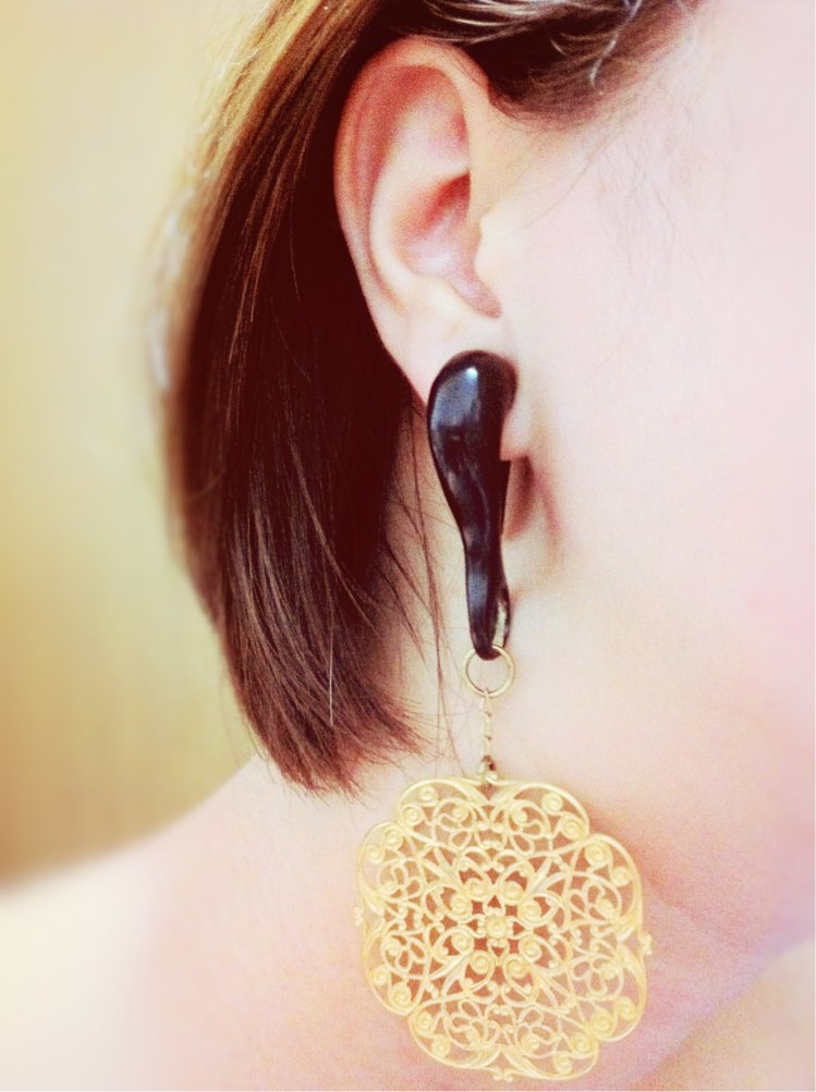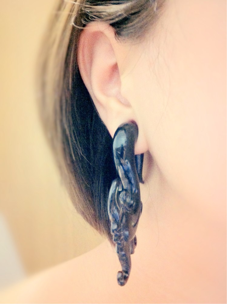 ハンギングピアスたちとお手入れの話 ピアス Comment:0 2013/06/20 やっとこハンギングの装着写真を撮ったので掲載してみたいと思います。Tawapa Black horn Ambrosia design 7/16"肩につかない程度の装着しやすいサイズです。普段使いにはもってこい。この流線的なデザインがなんとも素敵。ただ上手く前を向いてくれないのが残念です。私の装着方法がちょっと間違っているせいだと思います。うまい着け方を探り中。理想としては横か正面から見たときデザインがぱっと見えるようにしたいのですがどちらも中途半端になってしまいます。でも軽いしかわいいしとってもお気に入り。昨日は一日これで過ごしました。DiabloOrganics Brass mandala hanging design 7/16"Tawapaと比べるとだいぶ大きく感じます。金具部分がちゃらちゃらと肩に触れる程度。ブラス製なので金属アレルギーが心配でしたが今のところ全く問題なしで安心しました。この精緻なデザインはかなりお気に入りです。髪の下からどんとぶら下がっていると迫力があってかなり目立ちます。サイズをLargeと迷ったのですがこちらで十分でした。始めてホーン製のピアスを買ったのでお手入れ方法について少し調べてみました。BAFのFAQをざっと訳してみると・着用する前に中性洗剤と水で洗い、すすいだあとすぐ乾燥させる・水場に行く前にホーン製ジュエリーは外す・水に浸してはいけない・週に1回ヤシ油またはホホバオイルで軽く磨く・研磨布に油を含んで磨くと割れづらい状態を維持しやすい・直射日光の当たる場所、高湿度の場所に保管しない・完治したホールにのみ使用可能・ホーン製ジュエリーは滅菌、オートクレーブを使用できないとのこと。他、自分で調べた情報もほとんど同じようなものでしたがまとめてみます。・ホーンの主成分はタンパク質である・柔らかい清潔な布にオイル(オリーブ油、ベビーオイルなどでも可)を染み込ませて塗る・清潔を保つため汚れや汗、水気が付いたらすぐに拭きとる・着けっぱなしにしない・よく使って(触って)いれば人間の皮脂から油分を補給する・熱湯につけると変形する・太陽光に長時間当たるなどして乾燥すると割れる・とにかく乾燥に注意油分を補給してあげることと乾燥、多湿に気をつけることが重要なようです。今は届いてすぐベビーオイルで磨いて、その紙にくるんで保管中。あっているかな。取り扱いに慣れている方ならば基礎的なことなのでしょうがなにせ初めてなので心配性も手伝っていろいろと調べていました。せっかくのホーン製ジュエリー、きれいに長く使いたいものです。 http://rbrt.kuizu.net/pierce/%E3%83%8F%E3%83%B3%E3%82%AE%E3%83%B3%E3%82%B0%E3%83%94%E3%82%A2%E3%82%B9%E3%81%9F%E3%81%A1%E3%81%A8%E3%81%8A%E6%89%8B%E5%85%A5%E3%82%8C%E3%81%AE%E8%A9%B1ハンギングピアスたちとお手入れの話 [0回]